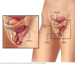 - Procedimientos retropúbicos. El cirujano hace un pequeño corte (incisión) en la vagina para acceder a la uretra. También hace dos incisiones pequeñas por encima del hueso púbico, a la derecha y a la izquierda del centro. El cirujano usa una aguja para pasar cada extremo del cabestrillo desde la vagina hasta el abdomen. El tejido blando mantiene en posición a lo largo de todo el cabestrillo. Los puntos absorbibles cierran la incisión vaginal, y las incisiones en la piel pueden sellarse con pegamento o con puntos.