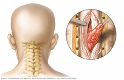 Esta imagen muestra la extirpación de un tumor de la médula espinal del cuello. Para acceder a la médula espinal, el cirujano realiza un corte a lo largo de la columna vertebral.